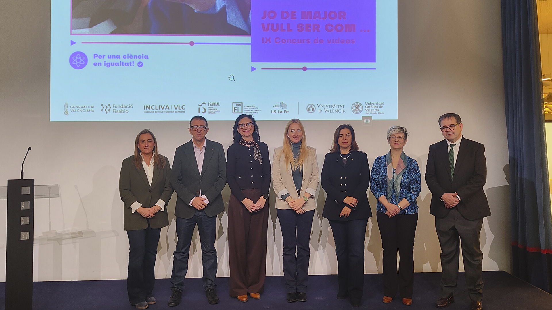 Coincidiendo con el Día Internacional de la Mujer y la Niña en la Ciencia, las fundaciones e institutos de investigación sanitaria dependientes de la Conselleria de Sanidad -Instituto de Investigación Sanitaria INCLIVA, Fundación para el Fomento de la Investigación Sanitaria y Biomédica de la Comunitat Valenciana (Fisabio), Fundación de Investigación del Hospital General de València (FIHGUV), Instituto de Investigación Sanitaria y Biomédica de Alicante (ISABIAL) e Instituto de Investigación Sanitaria La Fe (IIS La Fe)-, junto con la Universitat de València y la Universidad Católica de Valencia San Vicente Mártir, han celebrado la jornada de presentación de la IX edición del concurso de vídeos ‘De major vull ser com…’.