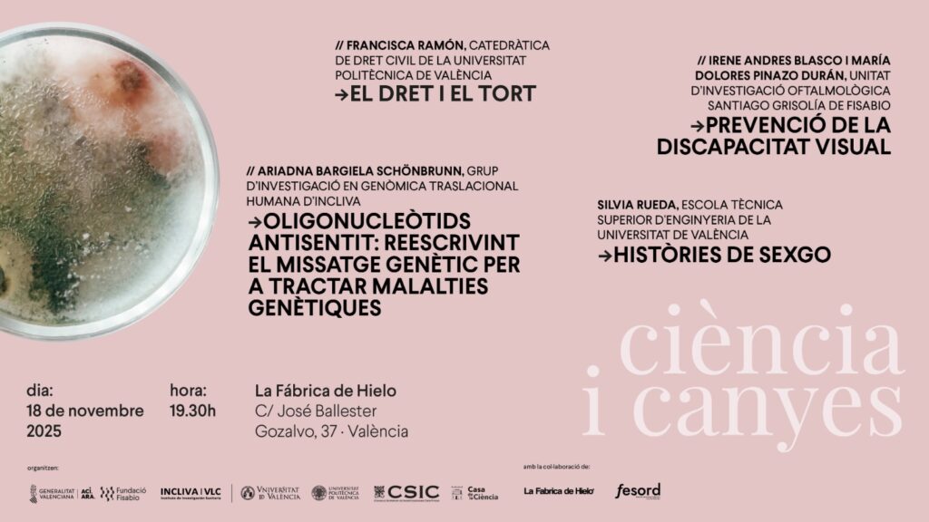 INCLIVA, la Fundación para el Fomento de la Investigación Sanitaria y Biomédica de la Comunitat Valenciana (Fisabio), la Universitat Politécnica de Valencia (UPV), la Universitat de València (UV) y la Delegación del Consejo Superior de Investigaciones Científicas (CSIC) en la Comunitat Valenciana presentan el próximo 18 de noviembre a las 19:30 horas una nueva sesión de Ciencia y Cañas.