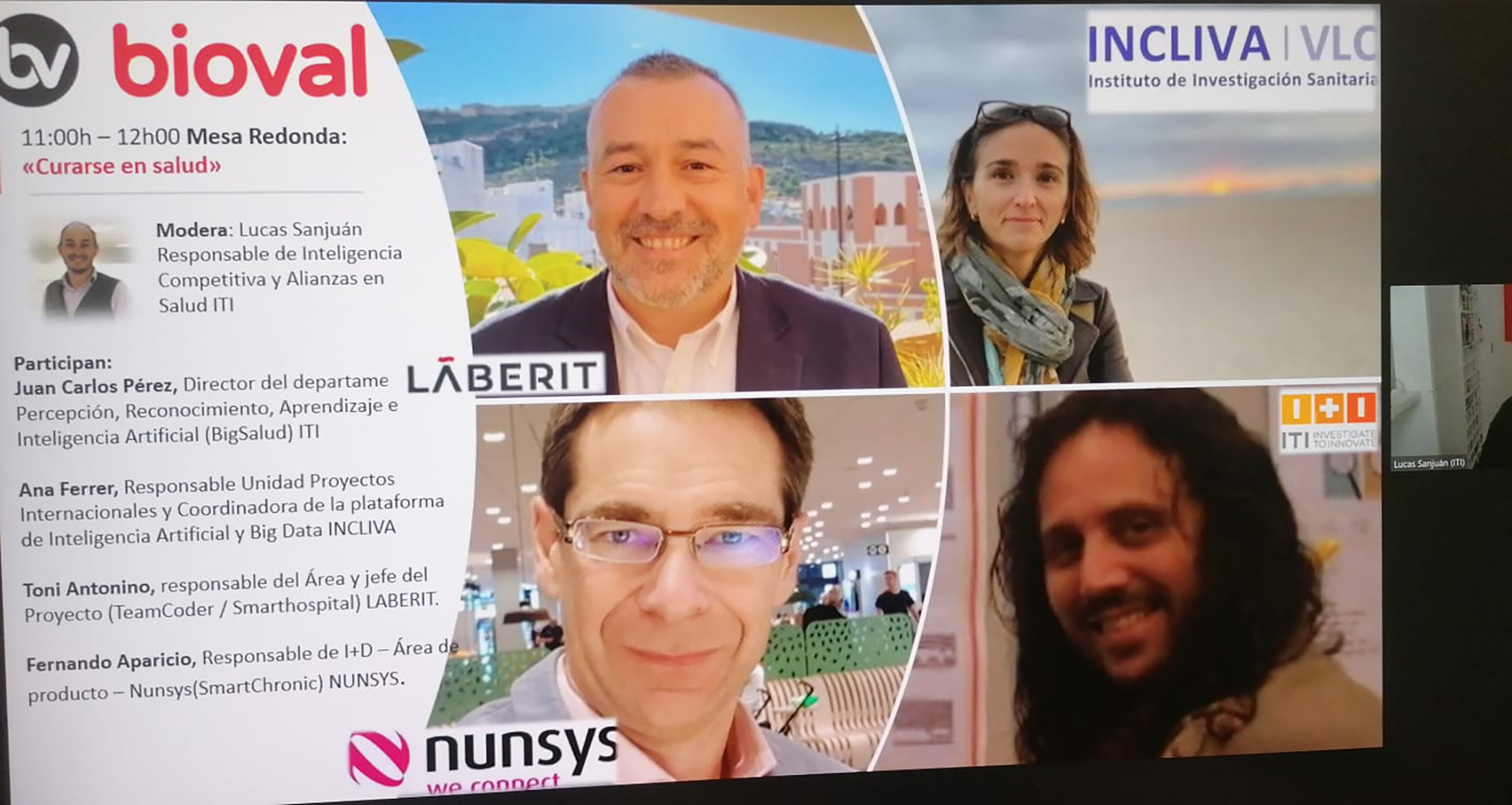 La responsable de la Unidad de Proyectos Internacionales y coordinadora de la plataforma de Inteligencia Artificial y Big Data de INCLIVA, la Dra. Ana Ferrer, ha formado parte del panel de expertos de la mesa redonda “Curarse en Salud” junto con Juan Carlos Pérez, director del departamento de Percepción, Reconocimiento, Autoaprendizaje e Inteligencia Artificial del ITI, Toni Antonino, responsable del Área y jefe del proyecto de LABERIT, y Fernando Aparicio, responsable de I+D de NUNSYS.