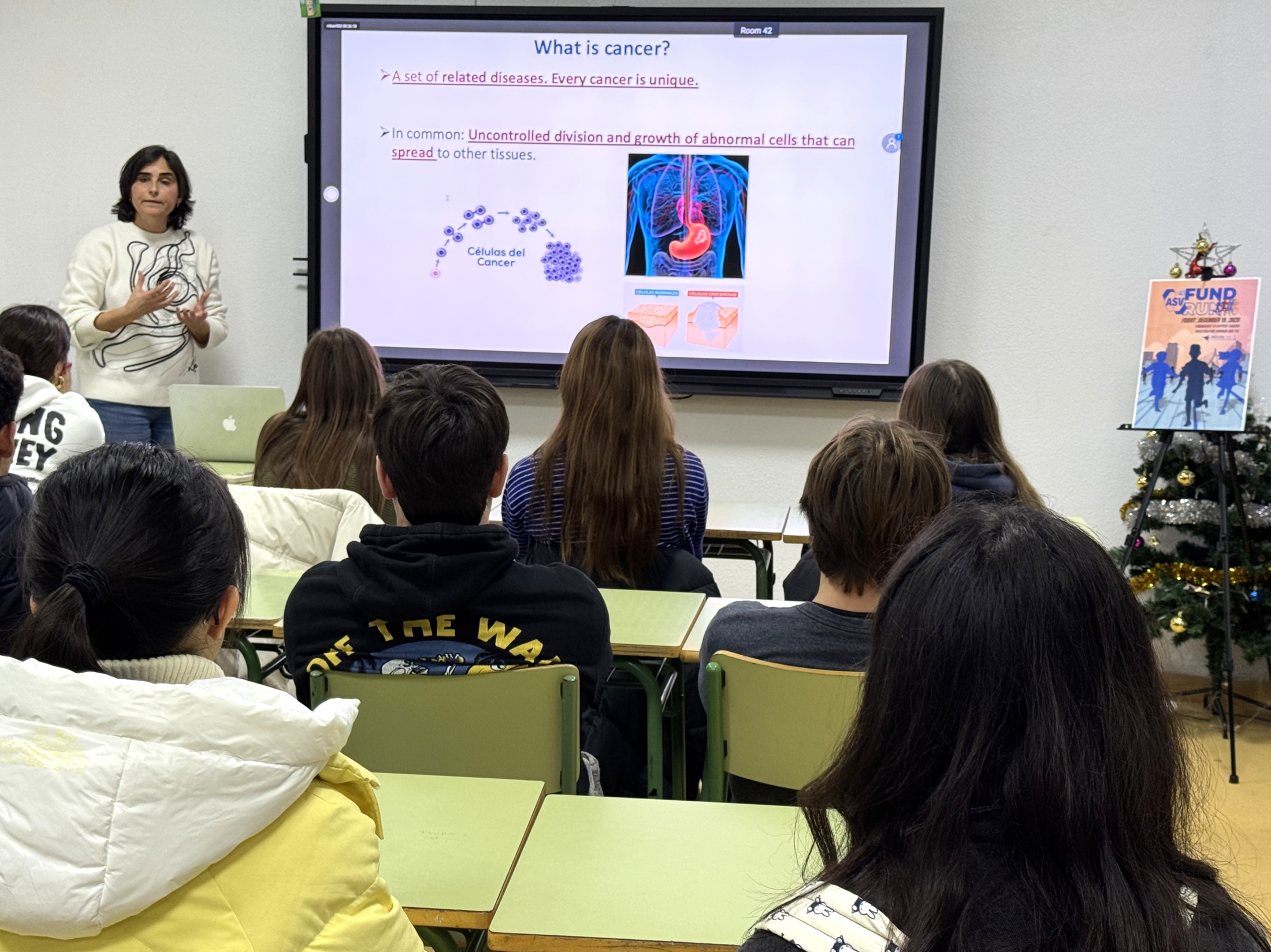 Esta iniciativa ha ido más allá del ámbito solidario y deportivo, incorporando también una dimensión educativa. El pasado 16 de diciembre, la responsable del grupo de investigación Traslacional en Cáncer Esofagogástrico, la Dra. Tania Fleitas, visitó el centro junto a la Dra. Josefa Castillo y el Dr. Manuel Cabeza para compartir con los estudiantes de último curso su experiencia en investigación oncológica, acercando la ciencia y la importancia de la investigación biomédica a las aulas.