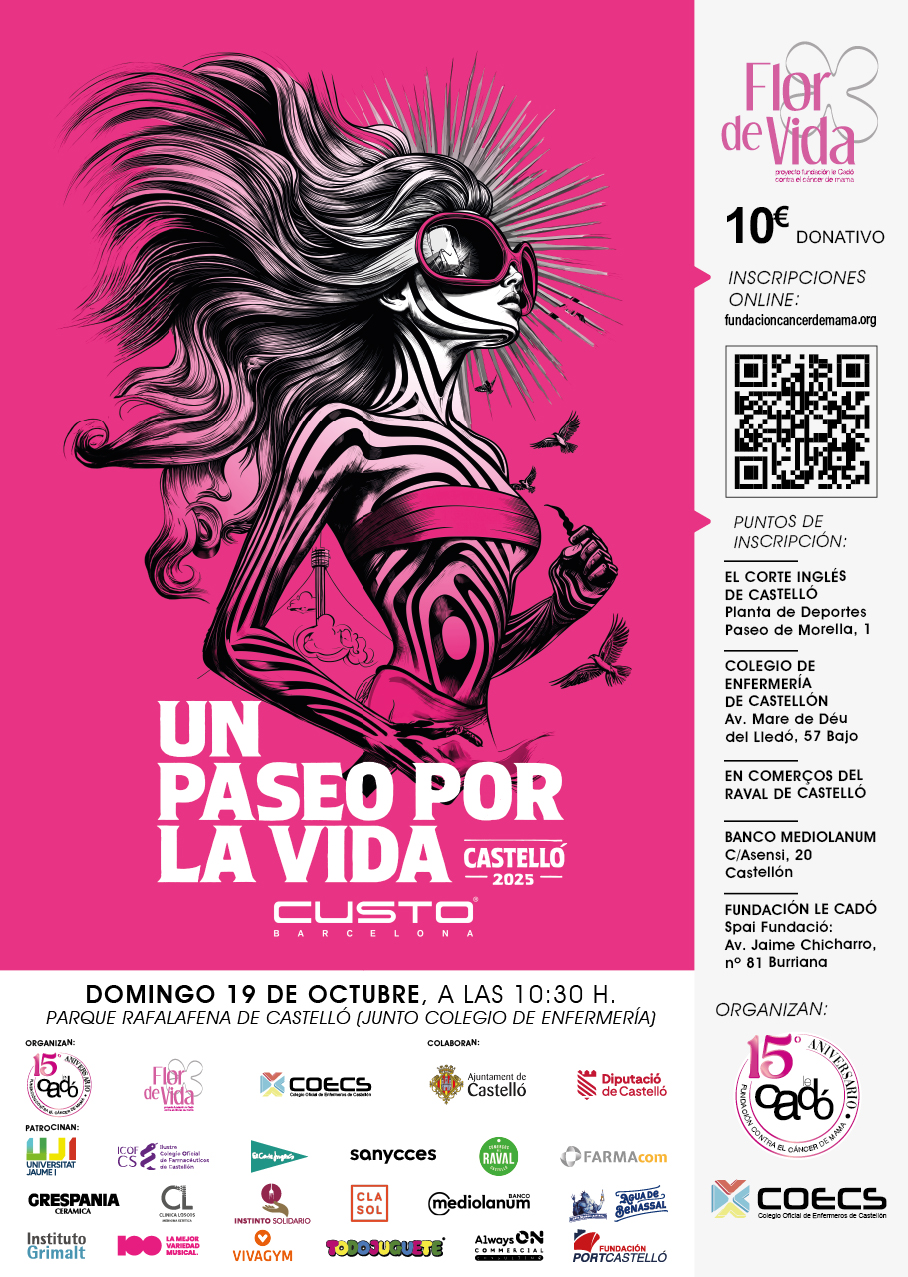 El domingo 19 de octubre a las 10:30 horas, Castelló volverá a convertirse en un símbolo de solidaridad con la XI Marcha solidaria ‘Un Paseo por la Vida’ contra el cáncer de mama, organizada por el Col·legi Oficial d’Infermeria de Castelló (COECS) y la Fundación Le Cadó, que se ha convertido en una cita imprescindible para apoyar la investigación y acompañar a todas las mujeres que luchan contra esta enfermedad.