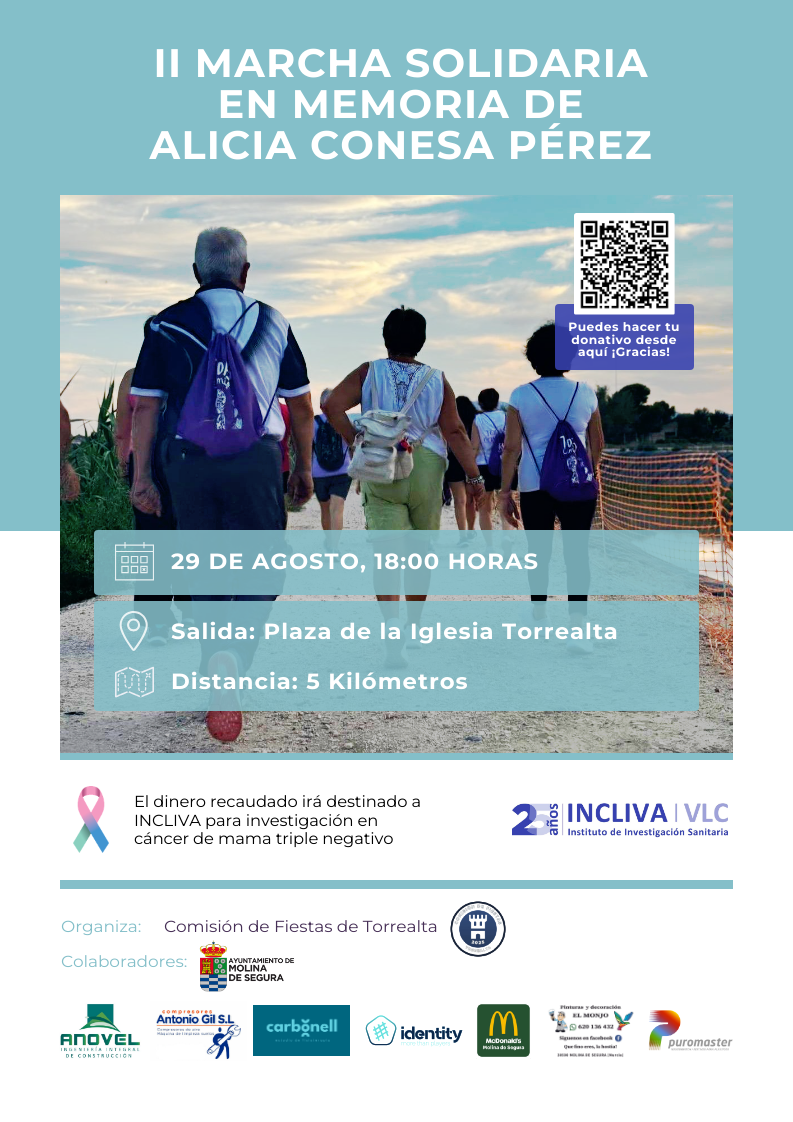 La II Marcha Solidaria en Memoria de Alicia Conesa está organizada por la Comisión de Fiestas de Torrealta y colaboran, además del Ayuntamiento de Molina de Segura, empresas locales como Anovel-Ingeniería Integral de Construcción, Compresores Antonio Gil, Estudio de fisioterapia Carbonell, Identity Sports, McDonald’s de Molina de Segura, Pinturas y decoración El Monjo y aditivos para plásticos Puromaster.