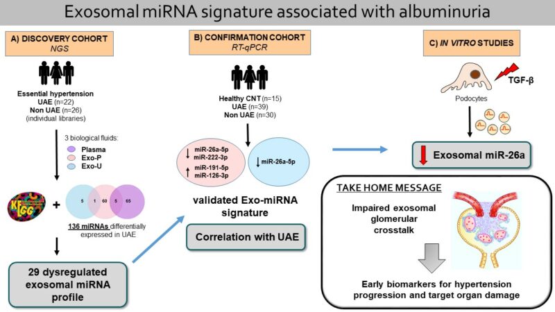 El presente estudio es el primero que analiza un perfil de microRNAs en tres biofluidos diferentes de manera simultánea: en plasma, en exosomas de plasma y en exosomas de orina de pacientes hipertensos. Los resultados han permitido establecer un perfil molecular compuesto por un grupo de microRNAs en el interior de exosomas de sangre y orina asociado a una elevada excreción de albúmina en orina, marcador temprano de disfunción renal, que regula mecanismos implicados en la integridad vascular y de filtración en el riñón. Los microRNAs son pequeñas moléculas circulantes que regulan la expresión de determinados genes y, por tanto, controlan procesos celulares vitales como el desarrollo y mantenimiento de la función renal. Se pueden encontrar libres en plasma y en el interior de exosomas, pequeñas vesículas extracelulares que son liberadas en sangre u orina por las células que componen nuestro organismo y que son jugadores esenciales en la comunicación entre los distintos tipos celulares dentro del riñón. Precisamente este aspecto ha sido analizado en un estudio del mismo grupo de investigación, recientemente publicado también en Hypertension.